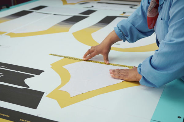 De stofrollen worden nauwkeurig gesneden volgens het patroon.